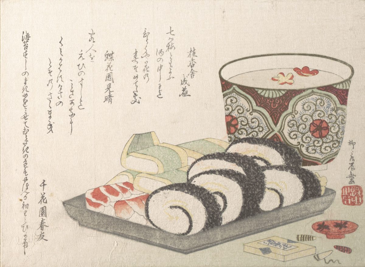 ※Ryūryūkyo Shinsai, Sushi and New Year’s Sake, Edo period, 1810, the Metropolitan Museum of Art collection (柳々居辰斎 画 桂香舎成益ほか 賛《狂歌摺物 寿司に酒中花》文化7年•1810、メトロポリタン美術館蔵)