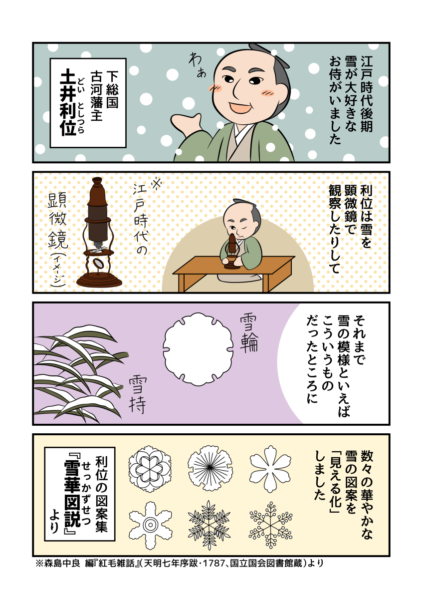 国立国会図書館の改題によると、『雪華図説』には、利位が顕微鏡で観察した図の他に、オランダ人のマルチネット(J. F. Martinet, 1729-1795)による著作『格致問答』(Katechismus der natuur)から引用した図も収録されています。