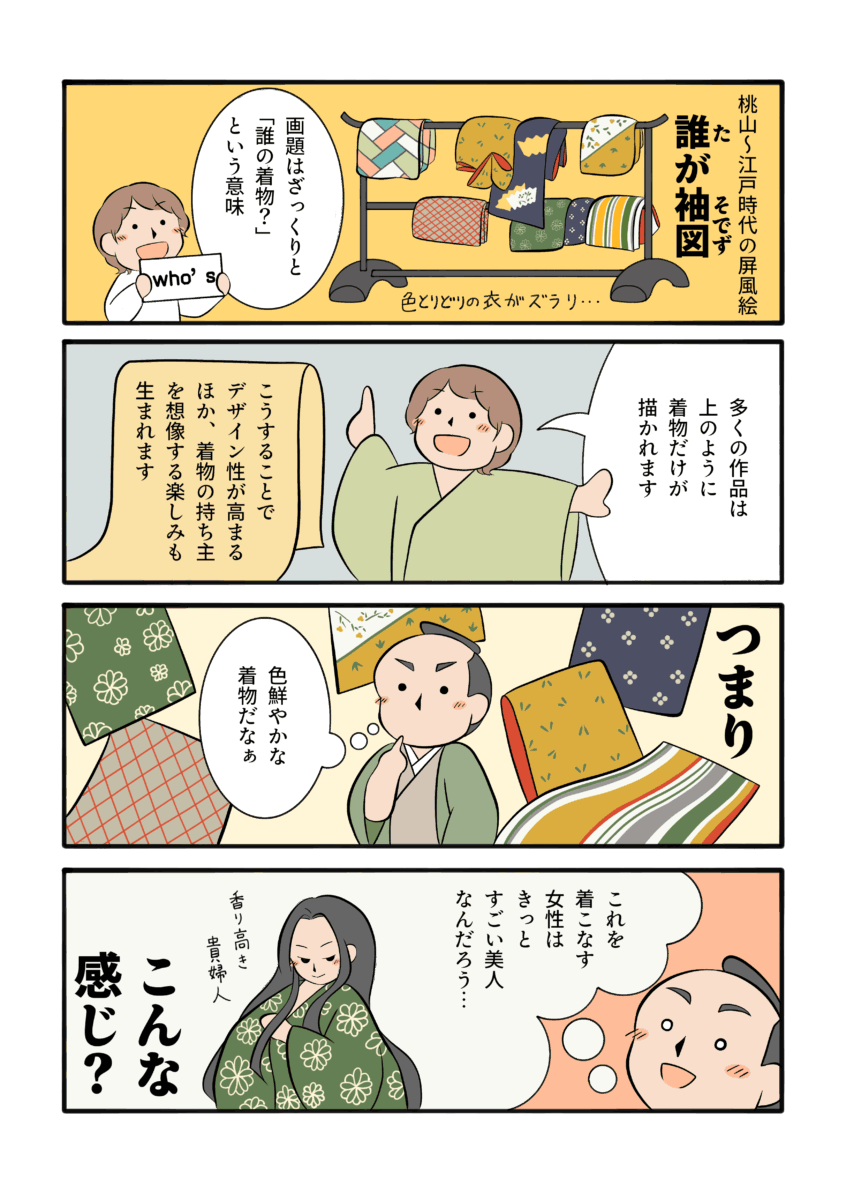 マンガの誰が袖図屏風は、メトロポリタン美術館蔵の《誰ヶ袖図屏風》を参照して描きました。↓