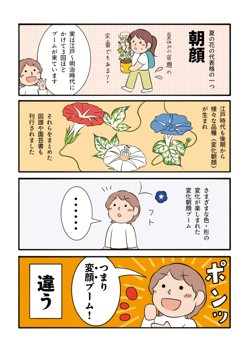 マンガの2コマ目の朝顔たちは、文化12年(1815)に刊行された朝顔の園芸書、『花壇朝顔通』を参照しました↓