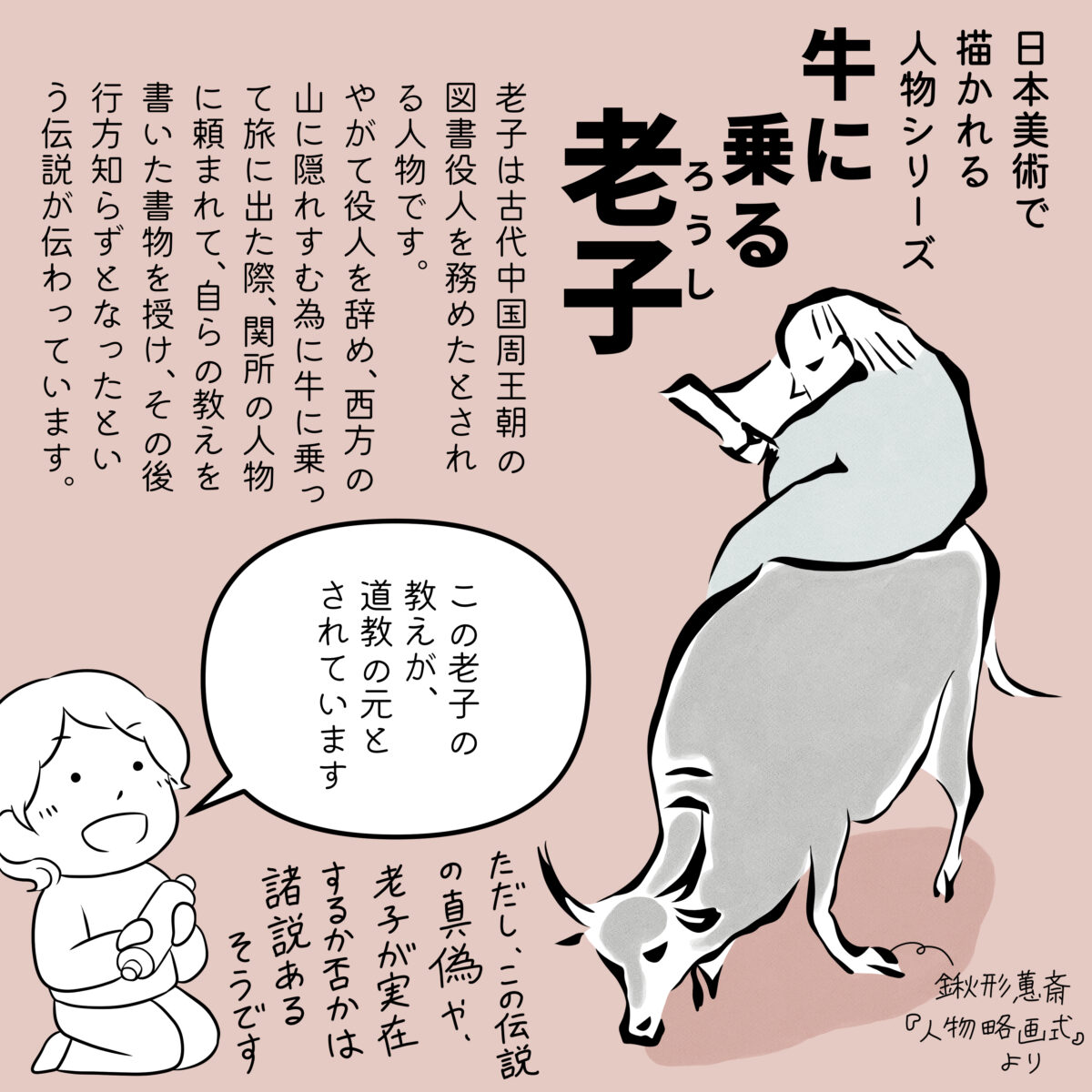 日本美術の掛軸や屏風などで描かれる人物シリーズ。今回は老子(ろうし)についてです。