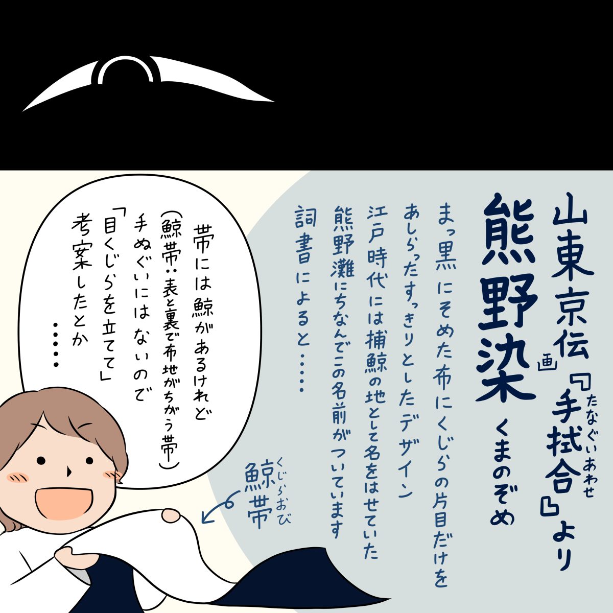 詞書(説明文)は「古来より鯨帯といへる事は聞と くしら手拭なきをは目くしら立て」とあります。
